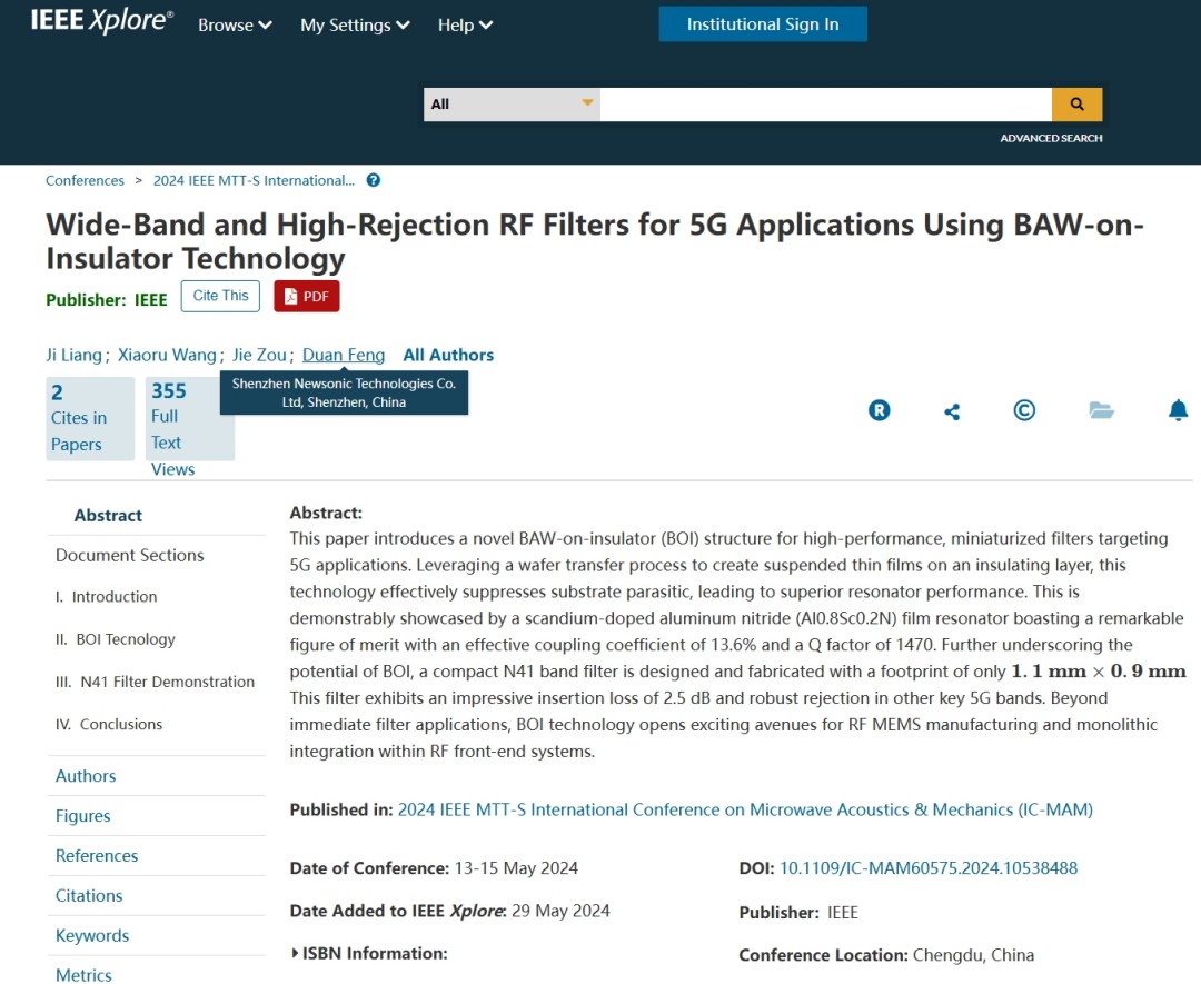 2024年5月13-15日,在中国成都召开的2024微波声学与力学国际会议(IC-MAM)上,新声半导体发布了标题为《Wide-band and High-rejection RF Filters for 5G Applications Using BAW-on-insulator Technology》(基于绝缘体上BAW技术的5G宽带高抑制射频滤波器)的成果,并做口述报告。