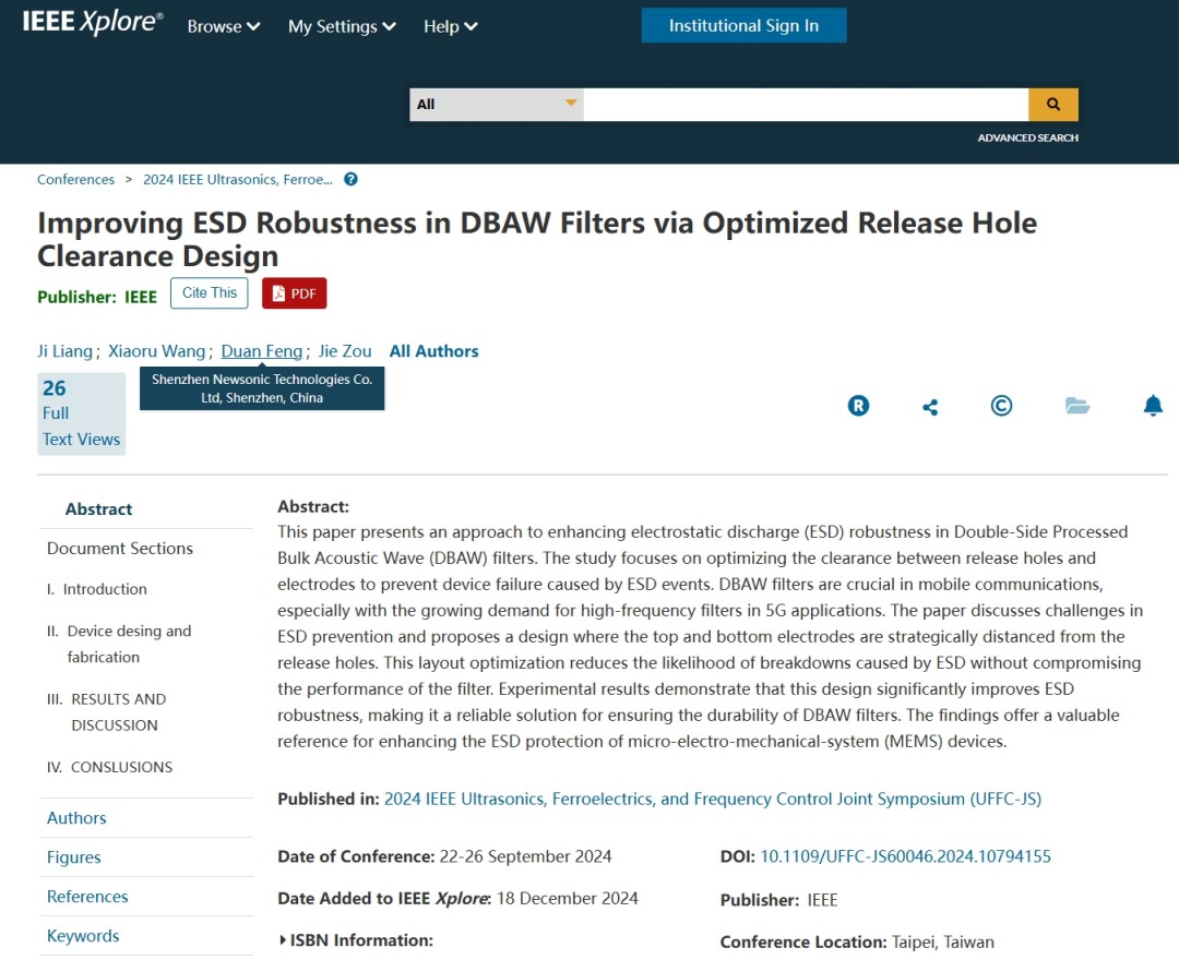 (中国·台北,2024年9月22日-26日)新声半导体在IEEE IUS 2024上发布了标题为《Improving ESD Robustness in DBAW Filters via Optimized Release Hole Clearance Design》的突破性研究成果,并做口述报告。