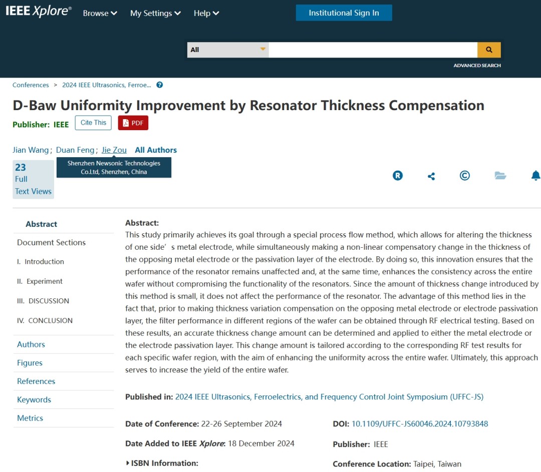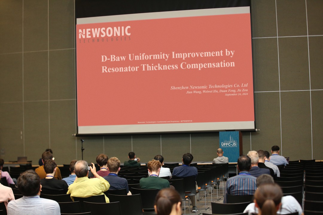 2024年9月22-26日,在中国台北举行的IEEE IUS 2024国际会议上,新声半导体研发团队发布了题为 《D-Baw Uniformity Improvement by Resonator Thickness Compensation》 的重要研究成果,并做口述报告。