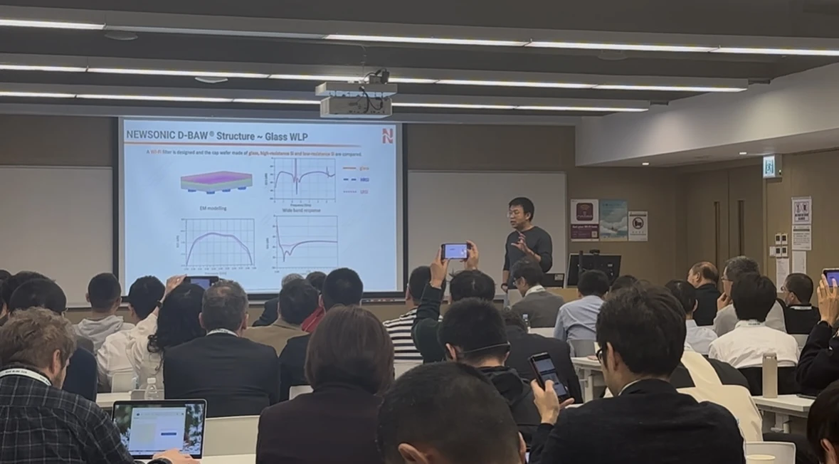 会议上,梁博士发表了关于新声半导体独立研发的基于双面图形化技术的薄膜体声波滤波器(DBAW)专题演讲,向全球同行展示了公司在高性能滤波器设计领域的最新技术成果,分享了创新理念与实践经验。